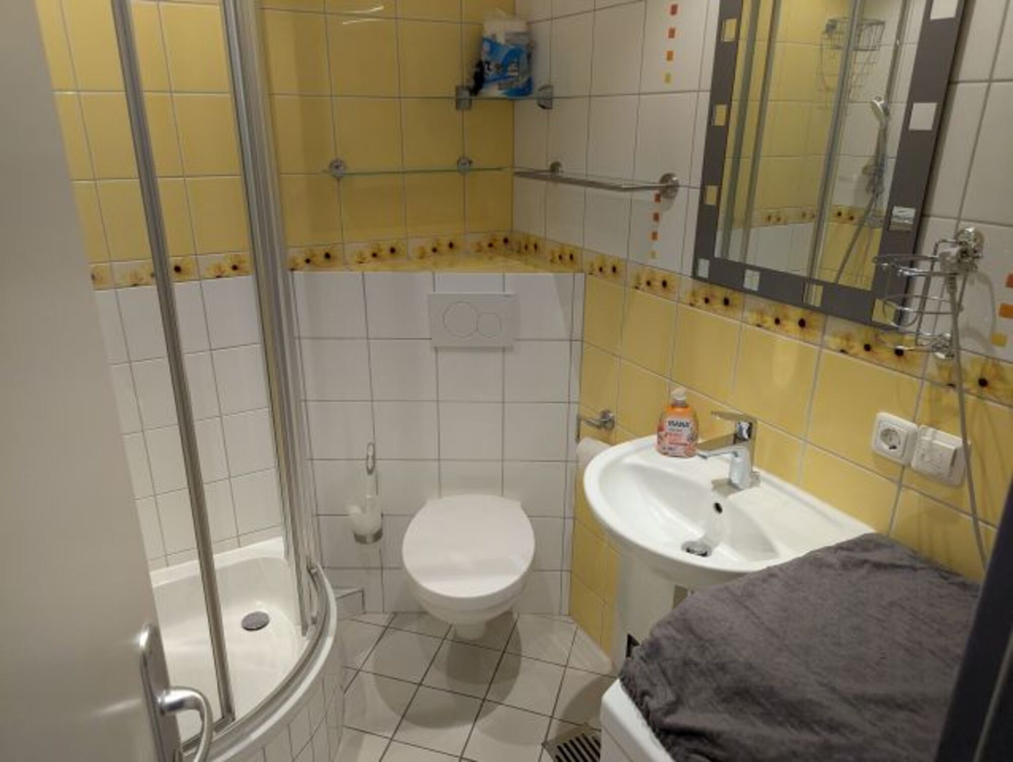 Im funktional eingerichteten Badezimmer befinden sich Dusche, Hänge-WC, Waschbecken, Handtuchheizkörper und Waschmaschine (Toplader).