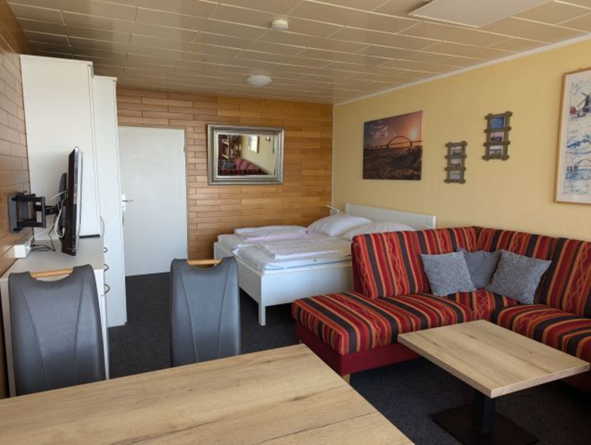 Im gemütlich gestalteten Wohn-/Schlafbereich befindet sich ein 180x200 cm großes Doppelbett mit 2 verstellbaren Lattenrosten und 2 getrennten Matratzen in der Größe 90x200 cm. Eine dreiteilige Couchgarnitur mit Couchtisch, eine Essecke mit 4 Stühlen sowie eine Stereokompaktanlage mit Radio und CD-Spieler komplettieren die Einrichtung. Sie finden genügend Stauraum im geräumigen Kleiderschrank und haben sowohl von der Couch, wie auch vom Bett einen freien Blick auf den 39" Flat-TV mit digitalem SAT-Anschluss.