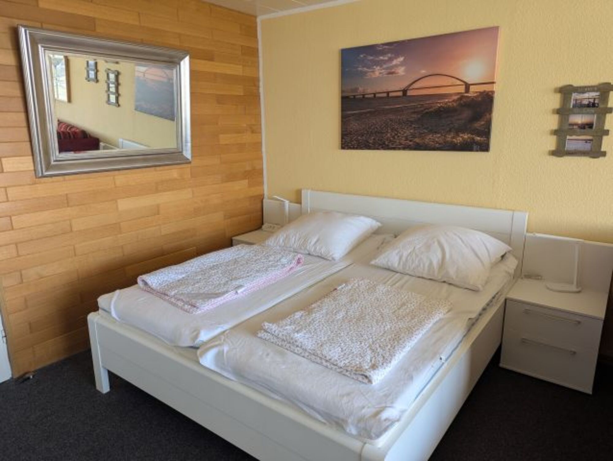Das zweite Zimmer ist ein Schlaf-/Kinderzimmer mit zwei Einzelbetten und Kleiderschrank. und FlatTV. Die neuen Möbel (Frühjahr 2017) sind im maritimen Stil gehalten und die Wände sind phantasievoll in bunten Farben gestrichen. Das Fenster dieses zweiten Zimmers ist mit einem fest eingebauten Fliegengitter, sowie einem Verdunklungsrollo versehen und für die Kleinen stehen Sandspielzeug und Kinderspiele bereit. Kinderreisebett und Kinderhochstuhl stehen kostenlos zur Verfügung.