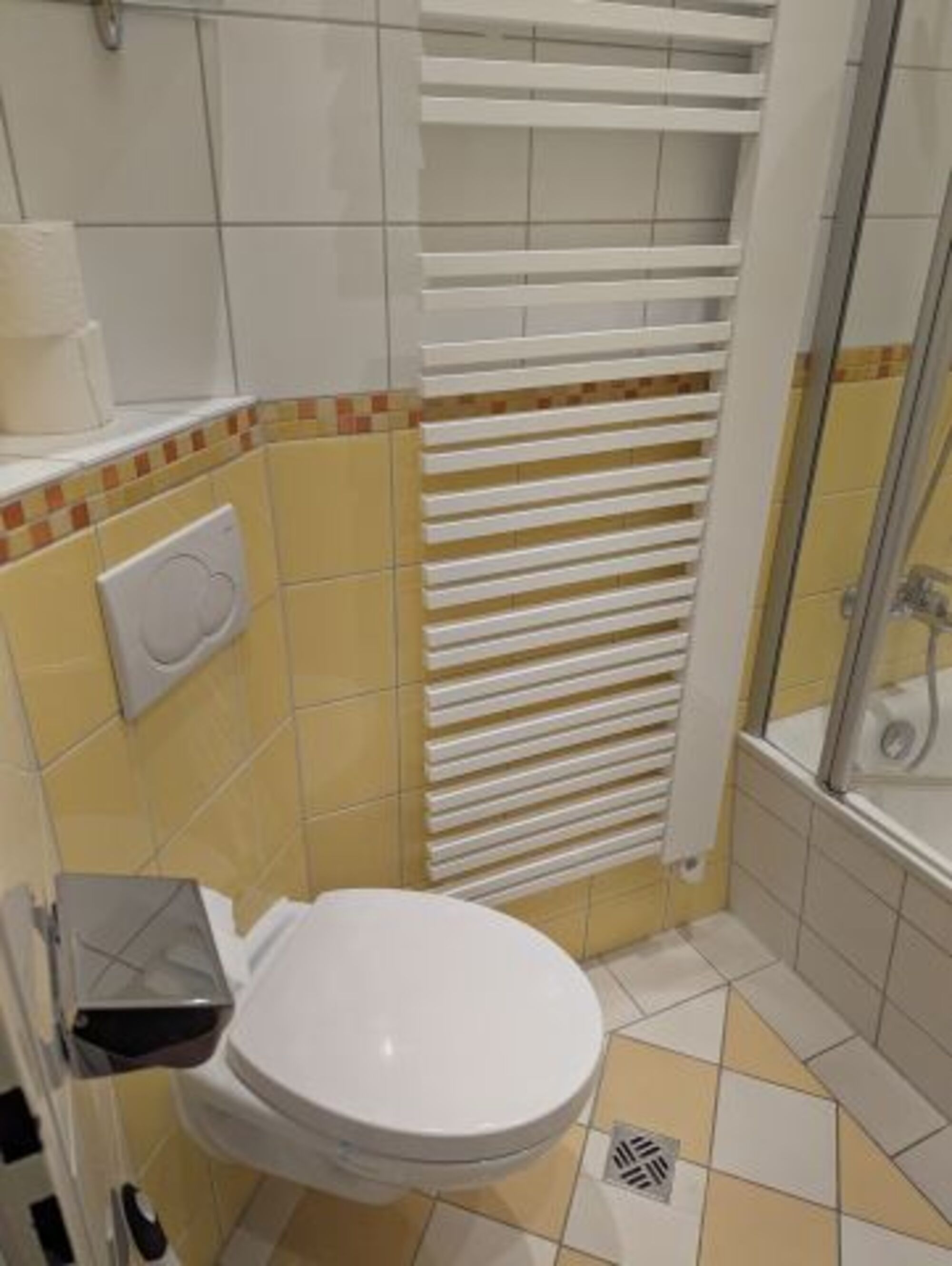 Im funktional eingerichteten Badezimmer befindet sich eine Badewanne mit Glasduschtür. Diese ist zum Baden und Duschen geeignet. Desweiteren gibt es ein Hänge-WC, Eckwaschbecken und Handtuchheizkörper.