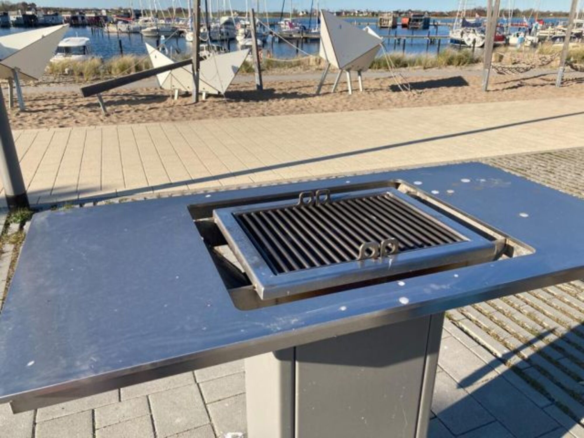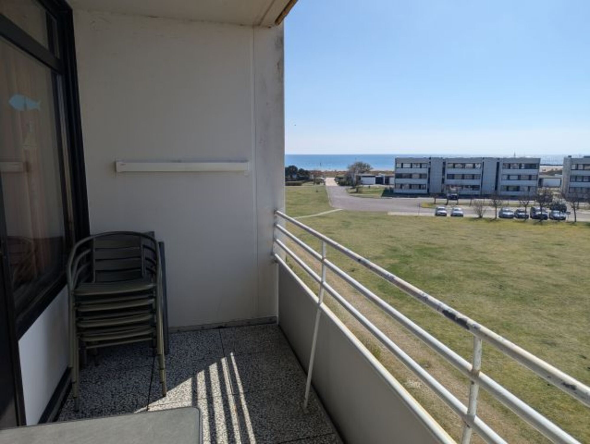 Die Terrasse, mit Tisch, Stühlen und Sonnenschirm, bietet sich bestens für ein Frühstück im Freien an und lädt zum gemütlichen Verweilen an frischer Ostsee-Luft ein. Zur zusätzlichen Sicherheit ist der Balkon mit einer erhöhten Brüstung von 1,06 m Höhe ausgestattet.
