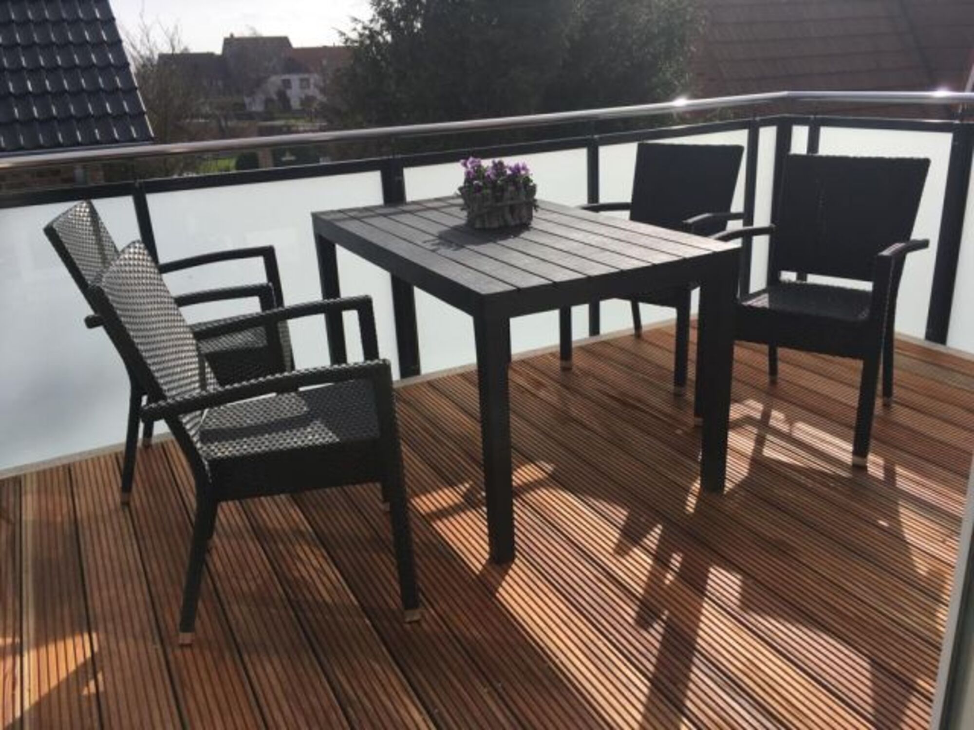 Die Balkonmöbel laden zum Entspannen und Sonnen ein.
