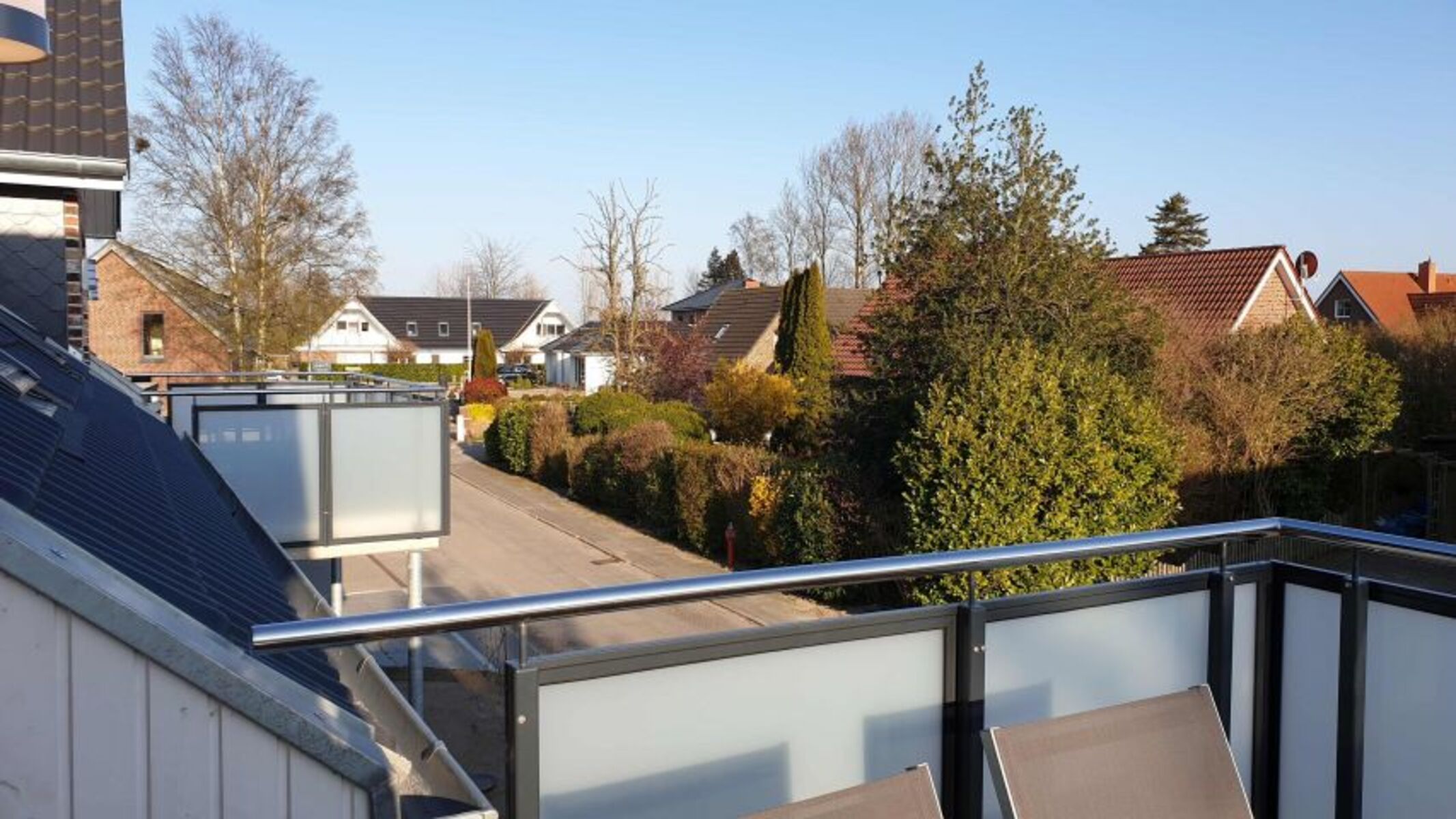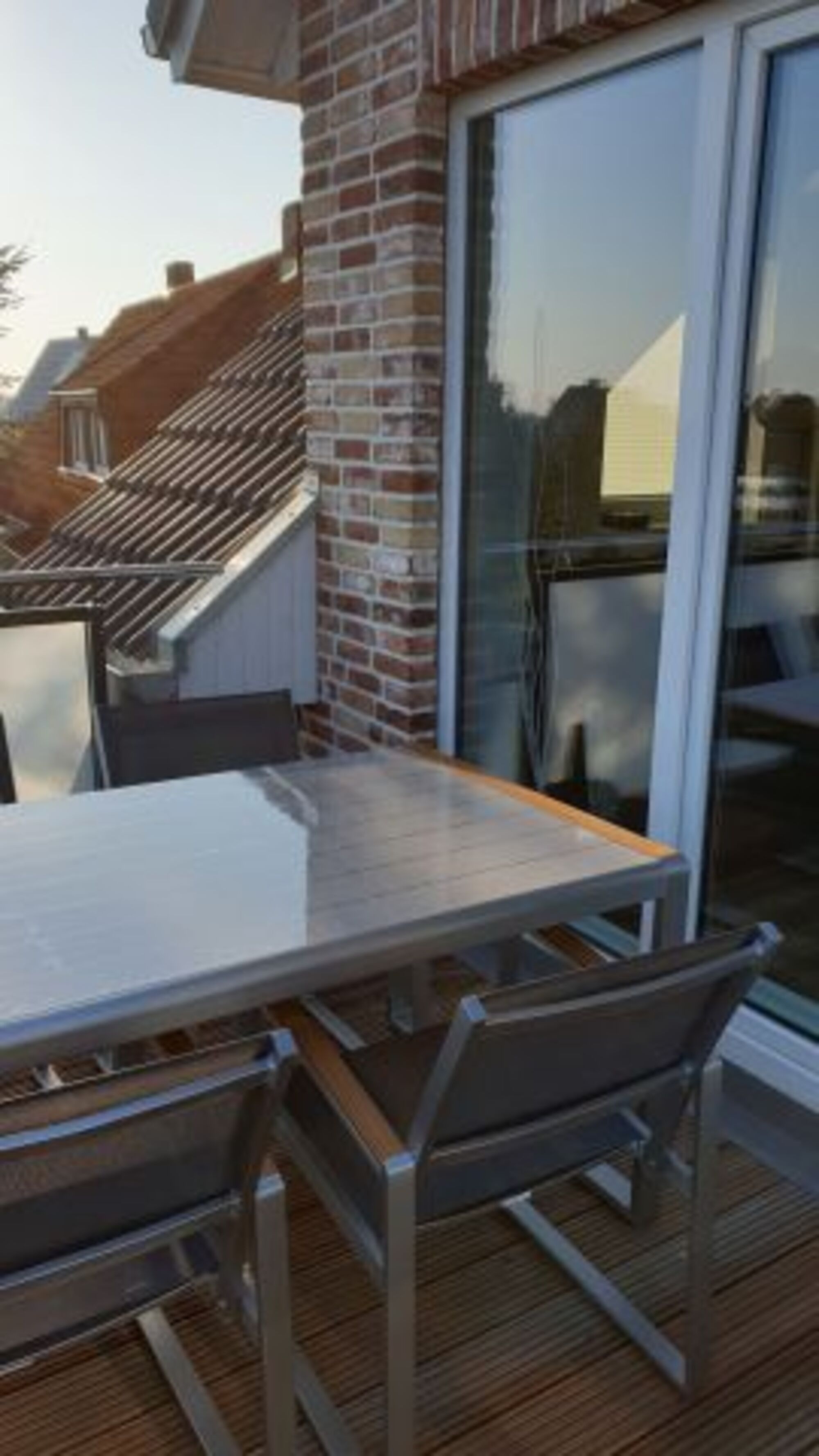 Die Balkonmöbel laden zum Entspannen und Sonnen ein.
