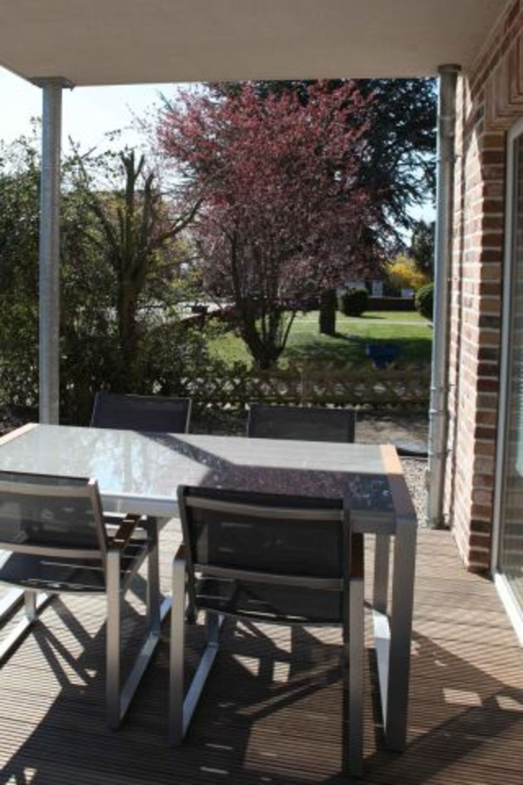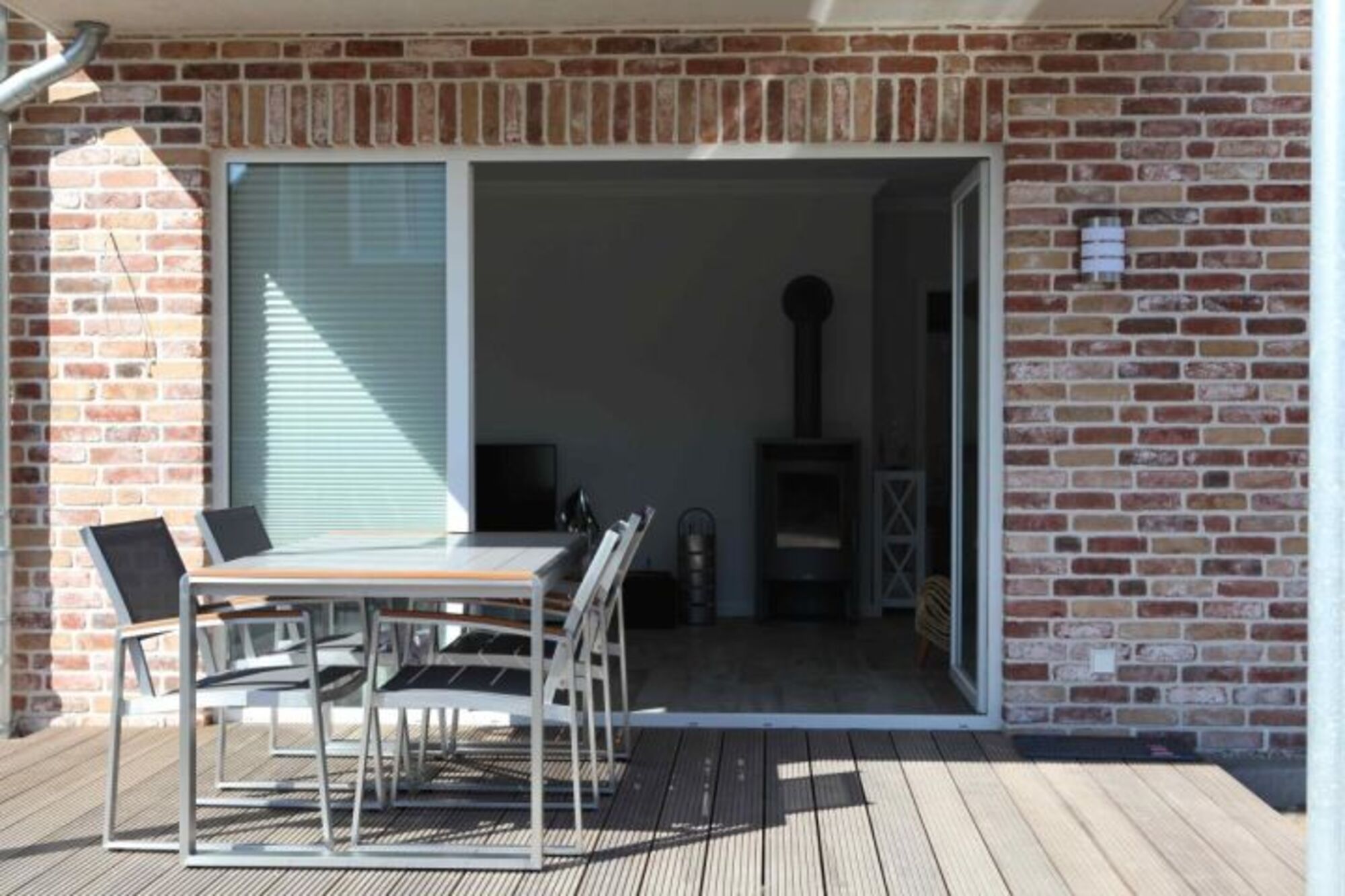 Vom Wohn- und Essbereich aus gelangen Sie nach draußen auf die Terrasse. Dort ist das Grillen mit einem Elektro-Grill möglich.