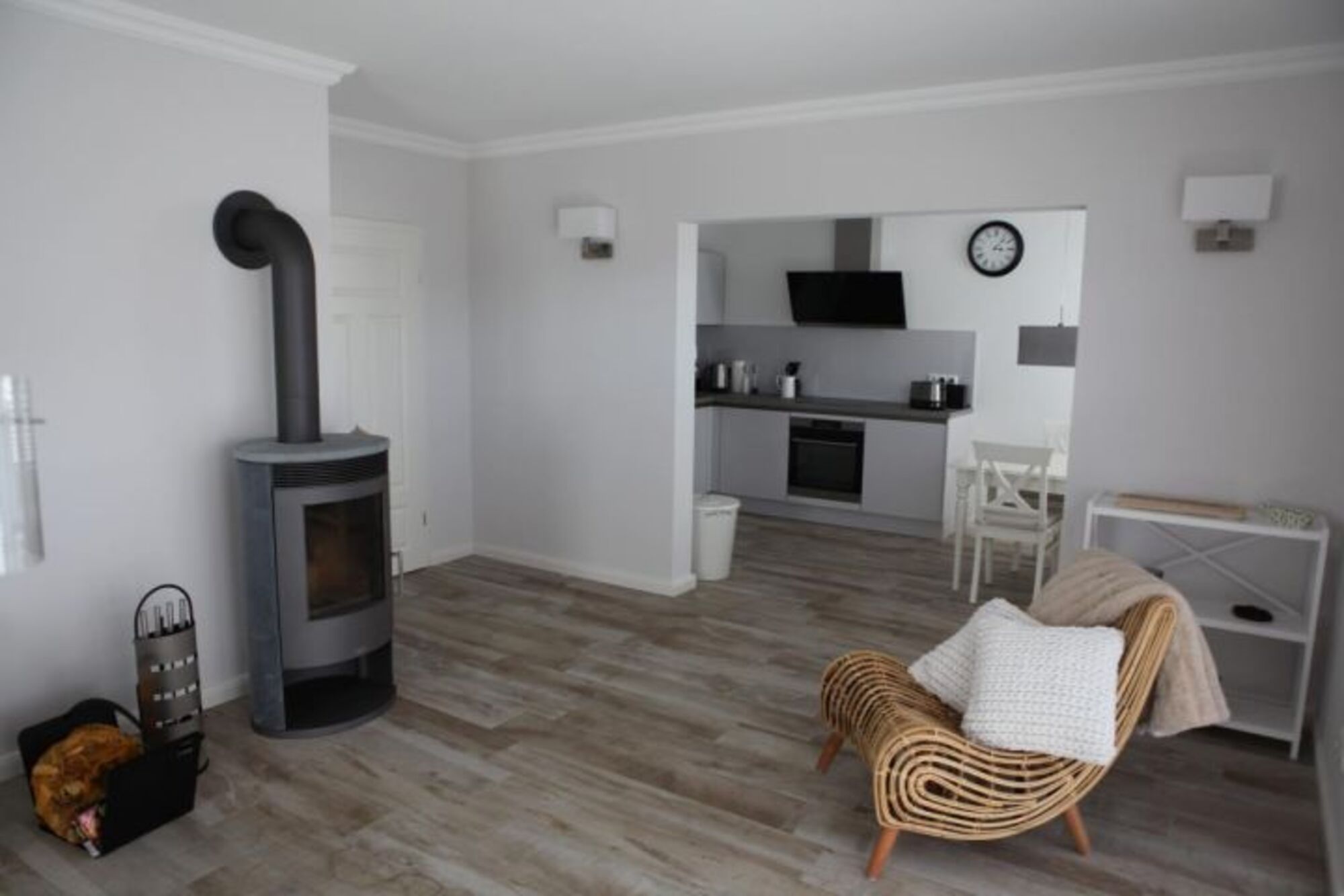 Das Ferienobjekt verfügt über eine Küche, zwei Schlafräume (jeweils mit einem Doppelbett ausgestattet), ein Badezimmer mit Dusche, einen kleinen Abstellraum mit Waschmaschine und Trockner und einen großen Wohn- und Essbereich mit Kamin-Ofen.