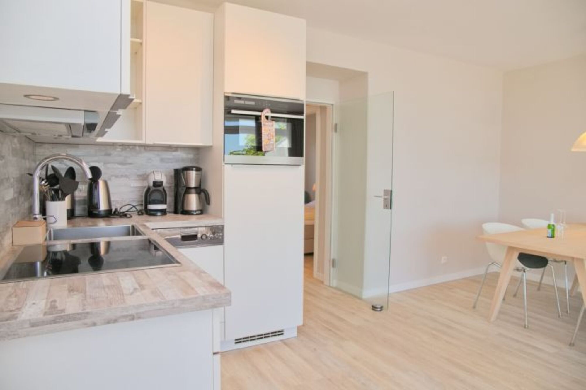 Die moderne Küche ist mit einem Cerankochfeld, einem Kompakt-Backofen mit Mikrowelle, einem Geschirrspüler, einem Kühlschrank mit Gefrierfach, einer Kaffeemaschine mit Thermoskanne, einem Wasserkocher und einem Toaster ausgestattet und mit hochwertigem (WMF, Zwilling, Maxwell Williams etc.) Inventar versehen.
