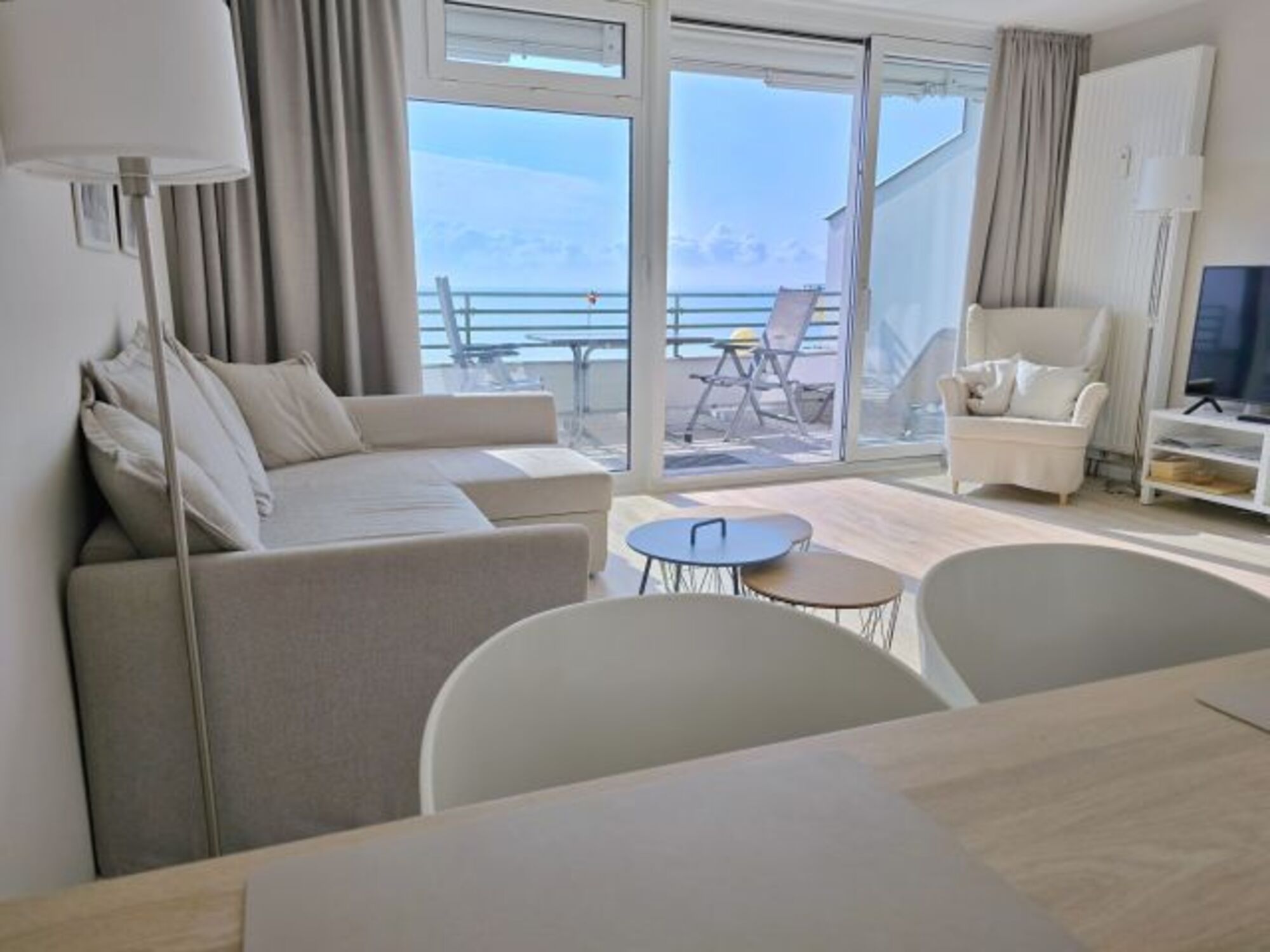 Das große Wohnzimmer mit offener Küche hat einen herrlichen Panoramablick auf die Ostsee. Die Essecke bietet 4 Personen Platz. Die Schlafcouch (140 x 200 cm) mit Sessel lädt zum Entspannen vor einem SmartTV ein. Ein Digitalradio mit Bluetooth-Streamingfunktion finden Sie hier ebenfalls.