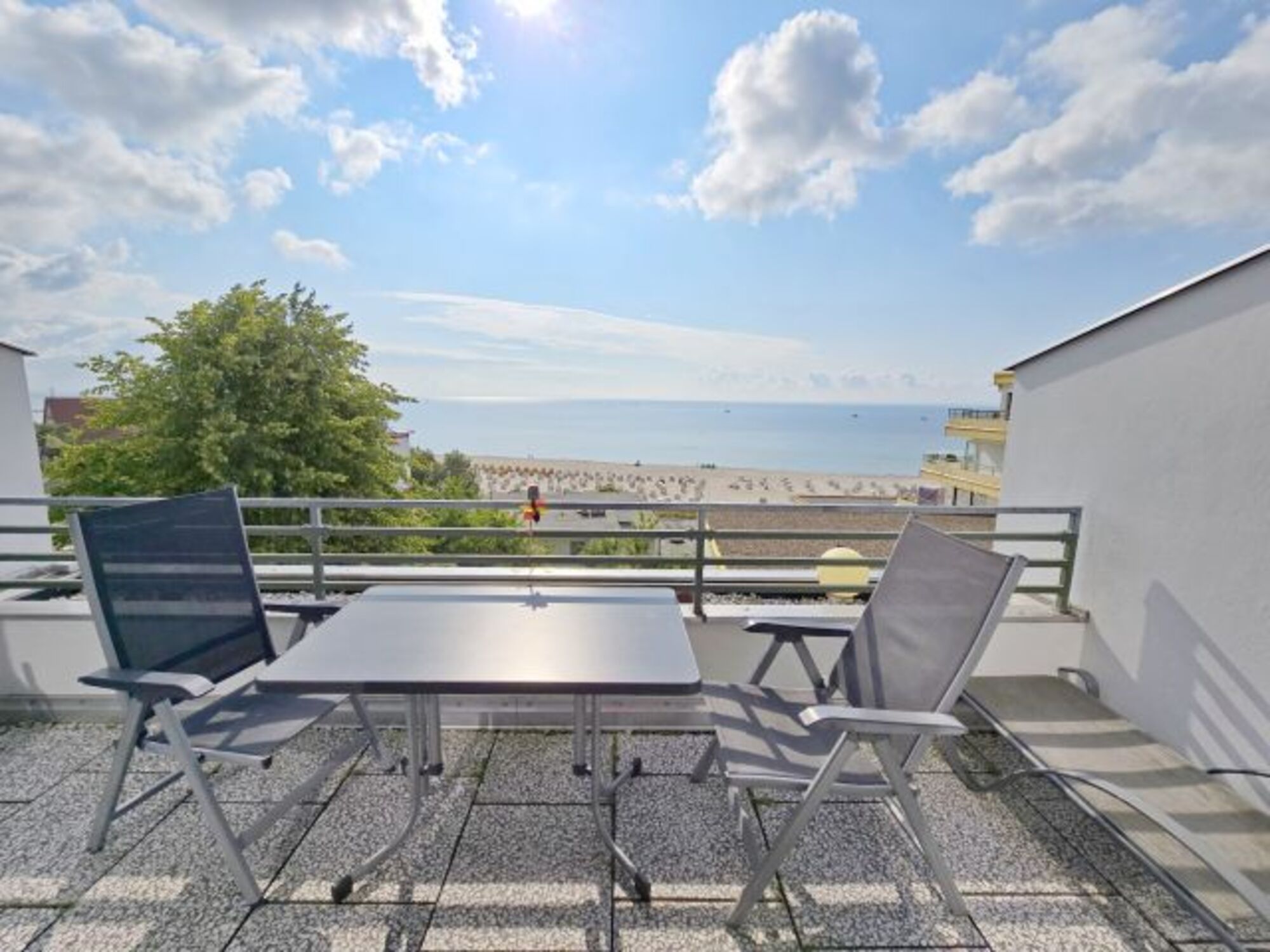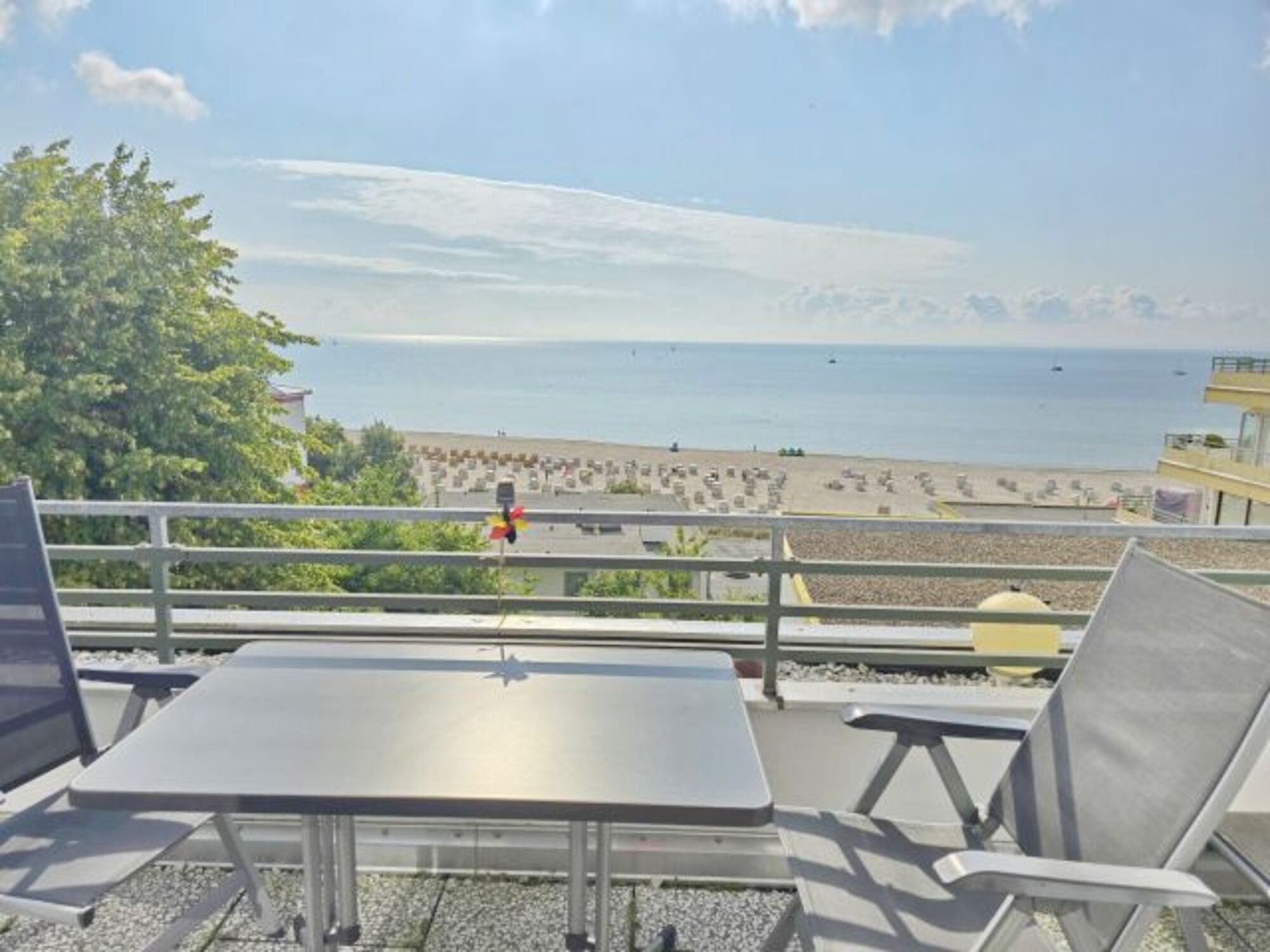 Der windgeschützte, große Balkon ist mit einem Tisch, zwei Hochlehnern, einer Bank, einer Liege, sowie einer elektrischen Markise ausgestattet. Der wunderbare Meerblick lädt zum Verweilen und Entspannen ein.