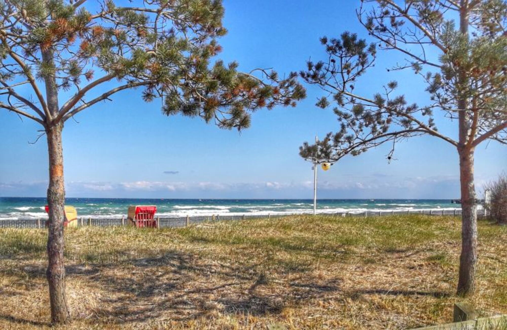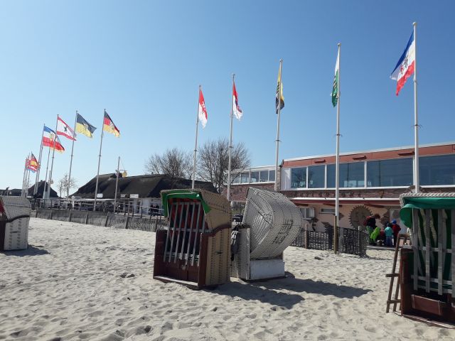 Zum Strand bzw. zur Strandpromenade sind es ca. 250m, also knapp 5 Gehminuten. Der kürzeste Weg beginnt gleich gegenüber des Berolina, wenn man den vorhandenen Schotterweg nutzt. Nur kurz über den Deich und man kommt an der Promenade am Kinderhafen raus.