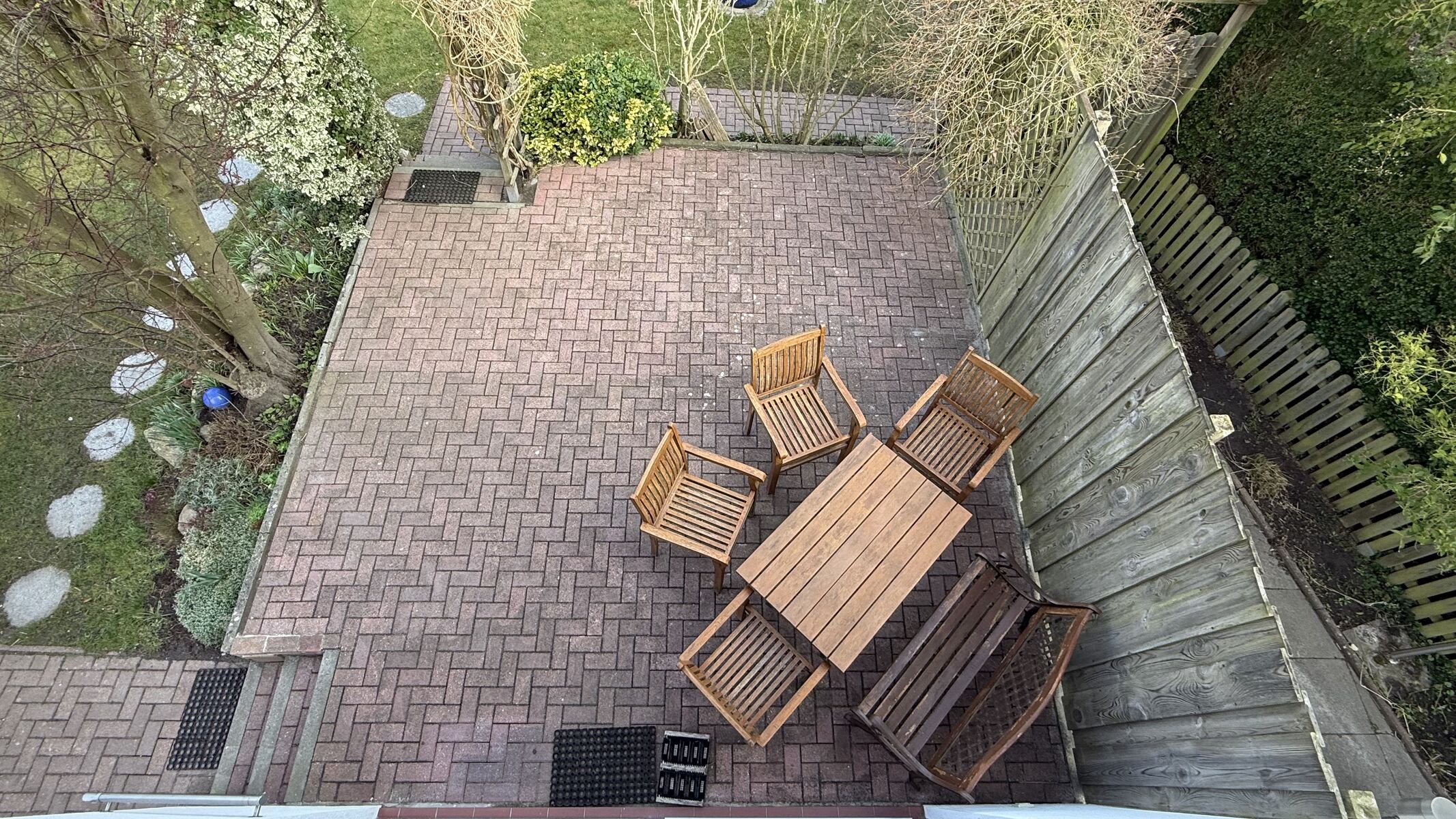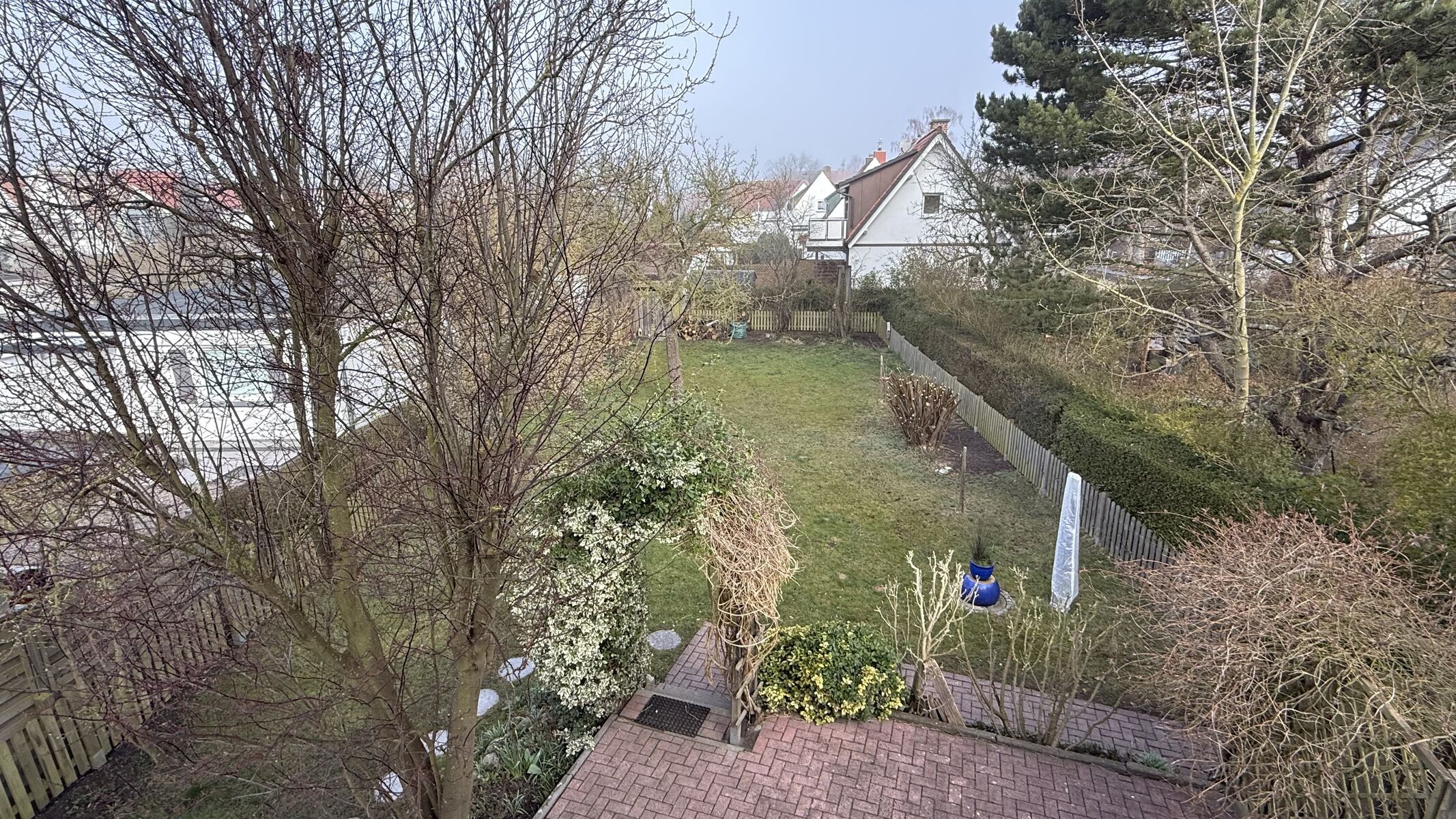 Eingezäuntes Grundstück mit großem Garten zur GemeinschaftsnutzungGroßes Ecksofa in U-Form im Wohnbereich