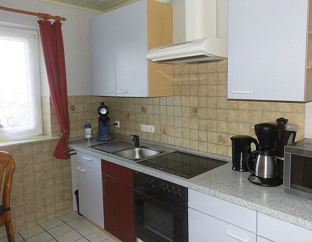 Küche: Einbauküche, E-Herd mit Ceran, Backofen, Kühlschrank, Gefrierfach, Essgelegenheit, Dunstabzug, Toaster, Kaffeemaschine, Wasserkocher, Geschirr, Besteck, Kochtöpfe / Pfannen, gefliester Boden.