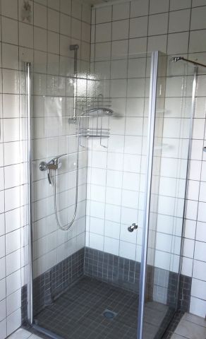 Badezimmer: Dusche & WC, Haartrockner, gefliester Boden.