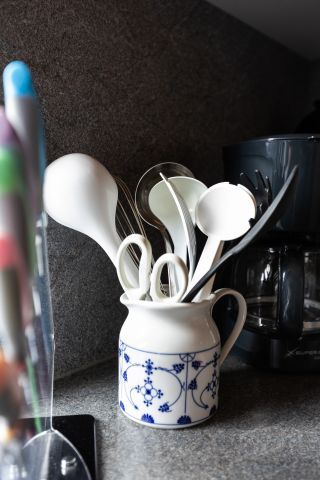 Wohnraum mit Küchenzeile,Geschirrspülmaschine, 4 Plattenherd mit Backofen, Mikrowelle, Toaster, Wasserkocher, Kaffeemaschine, Kaffeepadmaschine,Mixer,Eierkocher