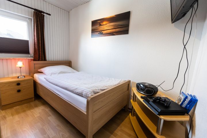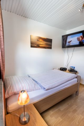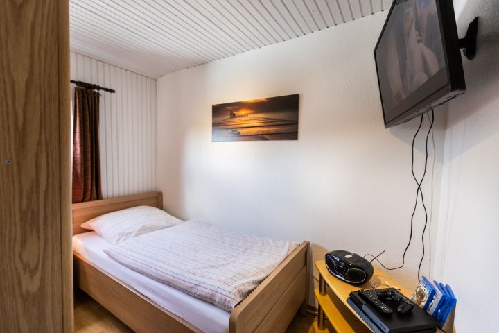 1 Schlafraum mit Einzelbett 2,00m x 1,00m Komfortlattenrost, Kleiderschrank 1x Nachtisch mit Lampe und Fernseher
