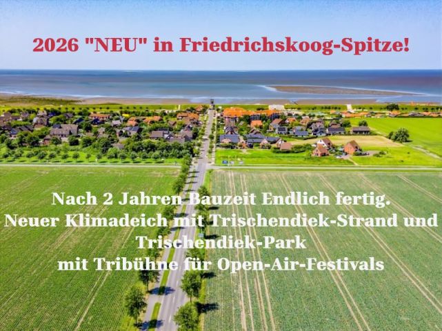 Bis zum neugestalteten Klimadeich und dem ca. 2,5 Kilometer langen Badestrand "Trischendiekstrand" (Fertigstellung Ende 2025 - Anfang 2026) von Friedrichskoog-Spitze mit Familienstrand, Hundestrand und FKK-Strand sind es nur 800 Meter.Ebenfalls nur 800 Meter entfernt ist der neu gestaltete Kurpark (Neueröffnung April 2025) mit großem Festplatz für die im Juli und August stattfindeten "Deichfestivals".
