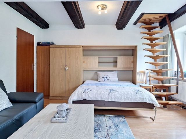 Über eine Spartreppe erreicht man einen zusätzlichen kleinen Schlafraum mit 2 Einzelbetten in Alkoven 90 x 190 cm.