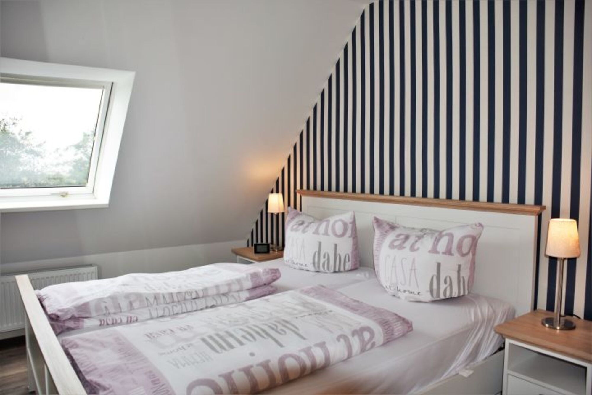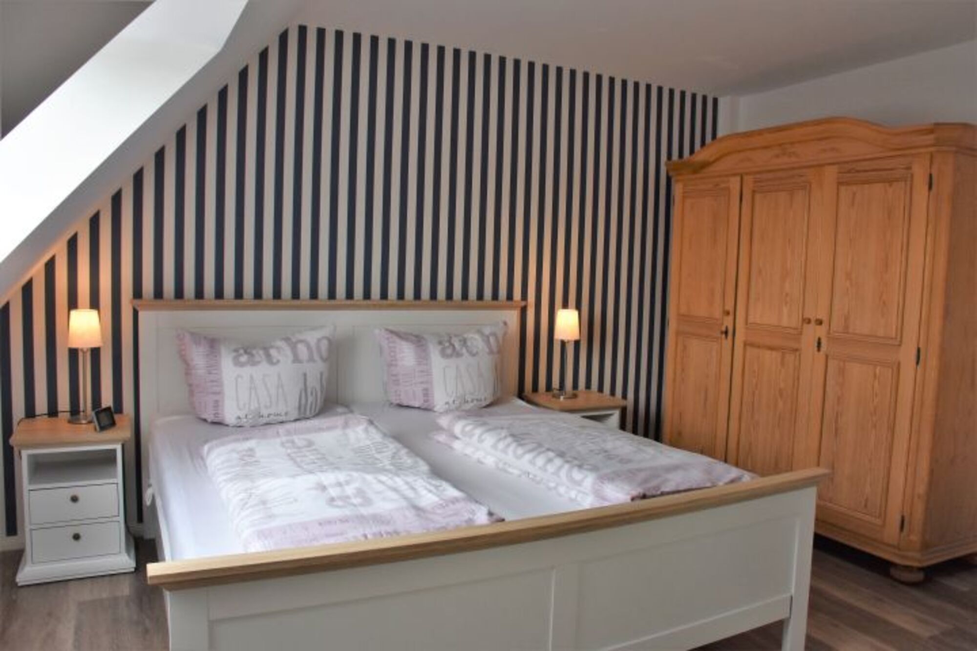 Im Schlafzimmer erwartet Sie ein gemütliches Doppelbett . Bettwäsche und Handtücher können Sie zum Preis von 23 Euro/Pers. von uns mieten (bei Wechsel zahlen Sie die gleiche Gebühr)