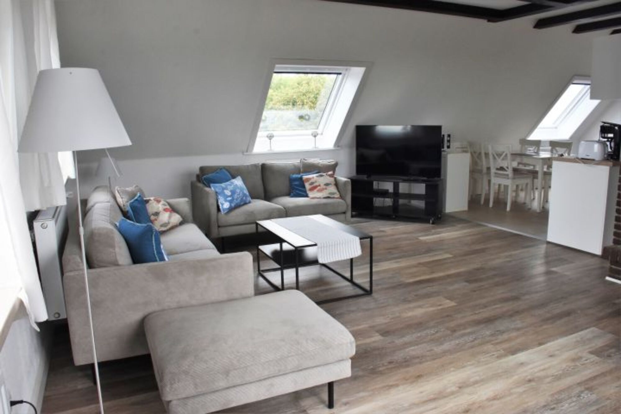 Das geschmackvoll eingerichtete Wohnzimmer ist ausgestattet mit einer Couchgarnitur, Flachbildfernseher und einem Essbereich.