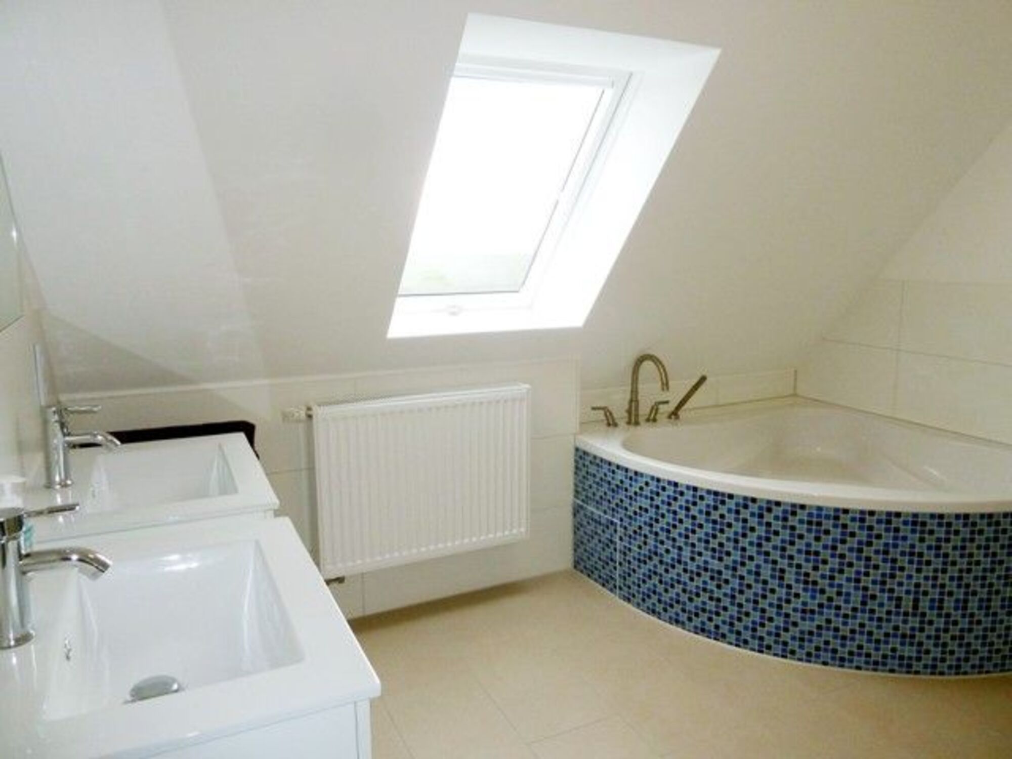 Das großzügige hell geflieste Badezimmer verfügt über eine Dusche, große Eckbadewanne, zwei Waschbecken und WC.