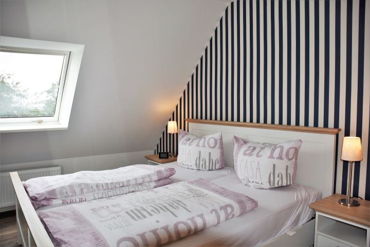 Im Schlafzimmer erwartet Sie ein gemütliches Doppelbett . Bettwäsche und Handtücher können Sie zum Preis von 22 Euro/Pers. von uns mieten (bei Wechsel zahlen Sie die gleiche Gebühr)