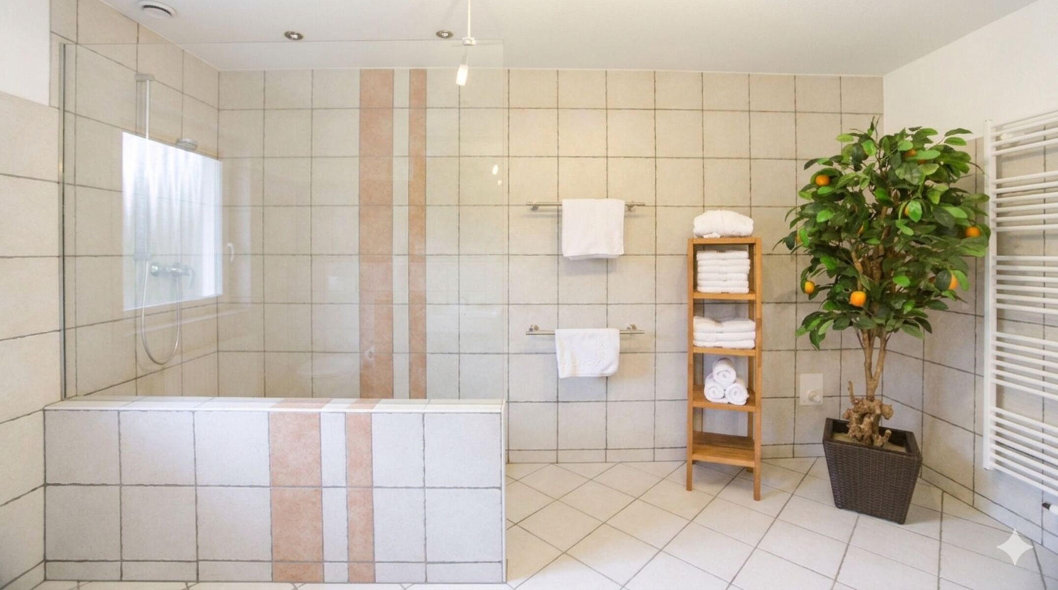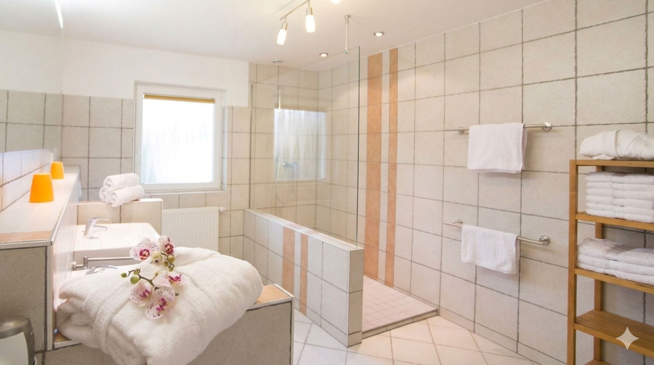 Großes Badezimmer mit Walk-In-Dusche und angenehmer Fußbodenheizung. Ein separates Gäste-WC sorgt für zusätzlichen Komfort.