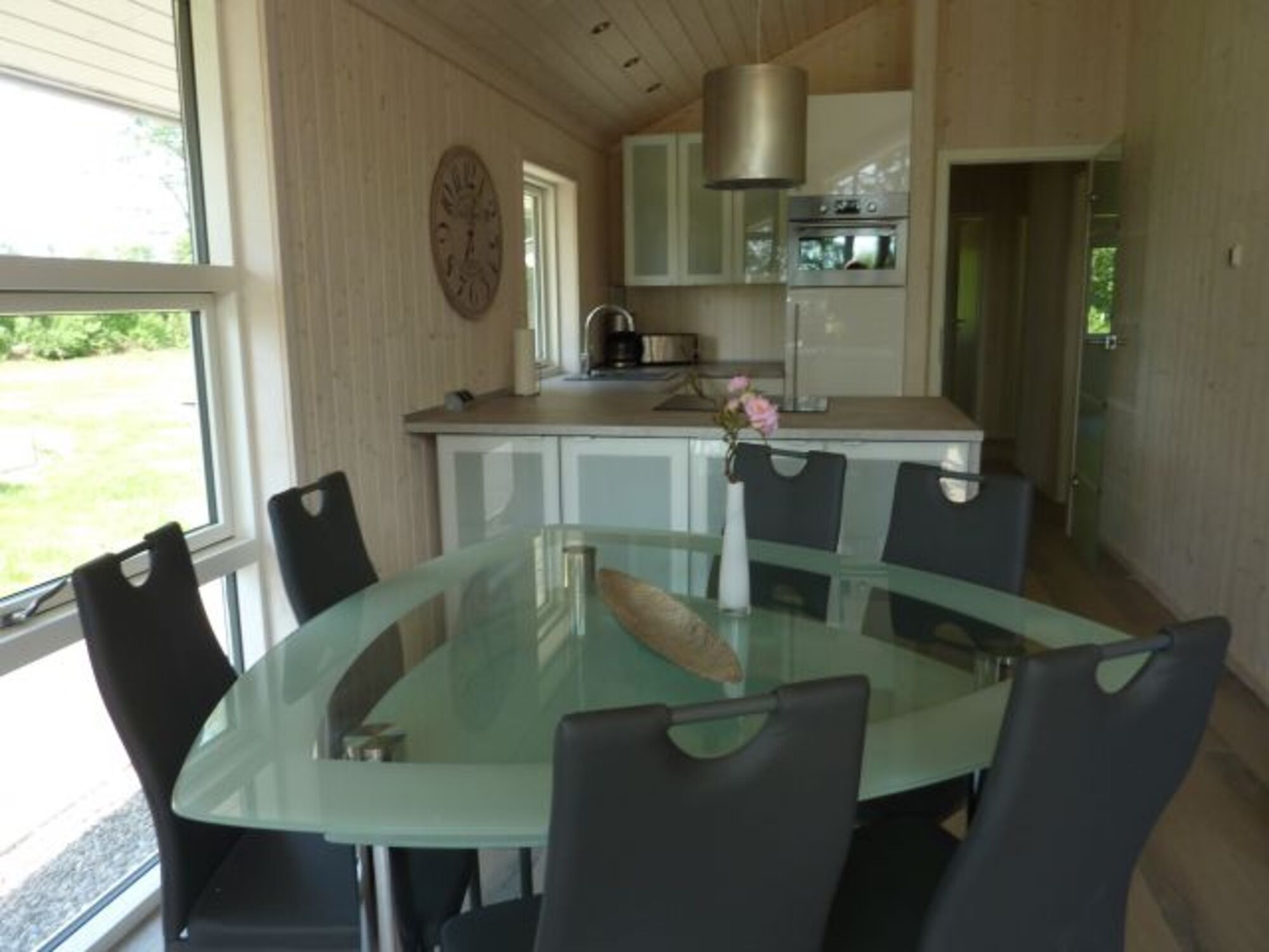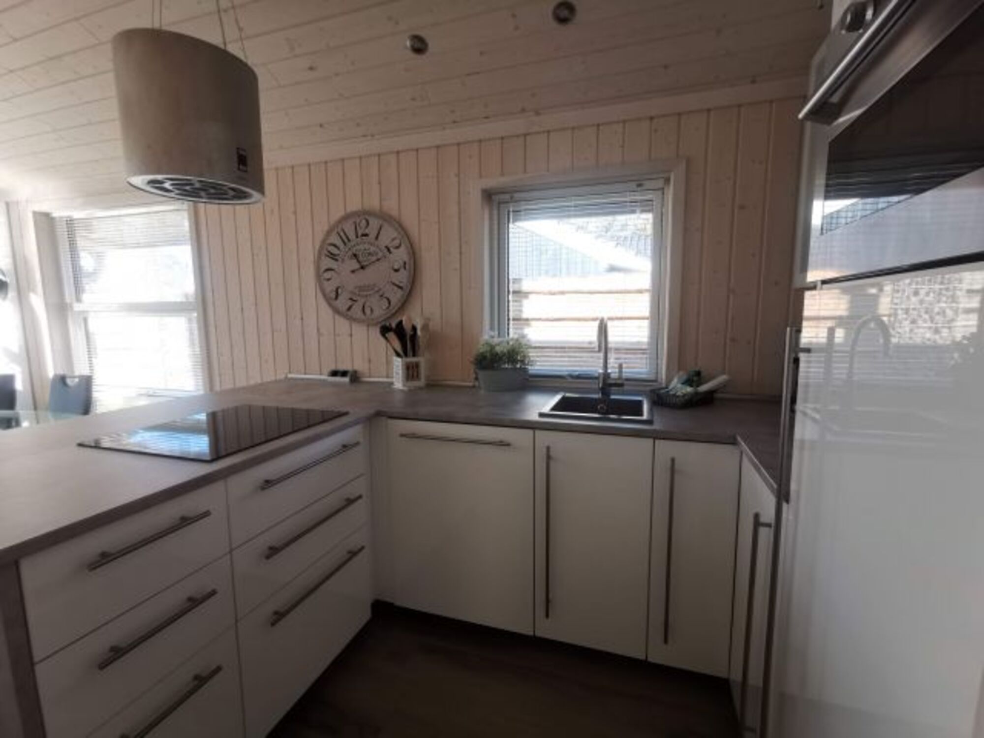 Geschirrspüler, Backofen-Mikrowellen-Kombi, Kühl-Gefrier-Kombi, Induktionskochfeld, Kaffeemaschine, Toaster, Wasserkocher und Dolce-Gusto und genügend Geschirr lassen eigentlich nichts vermissen.