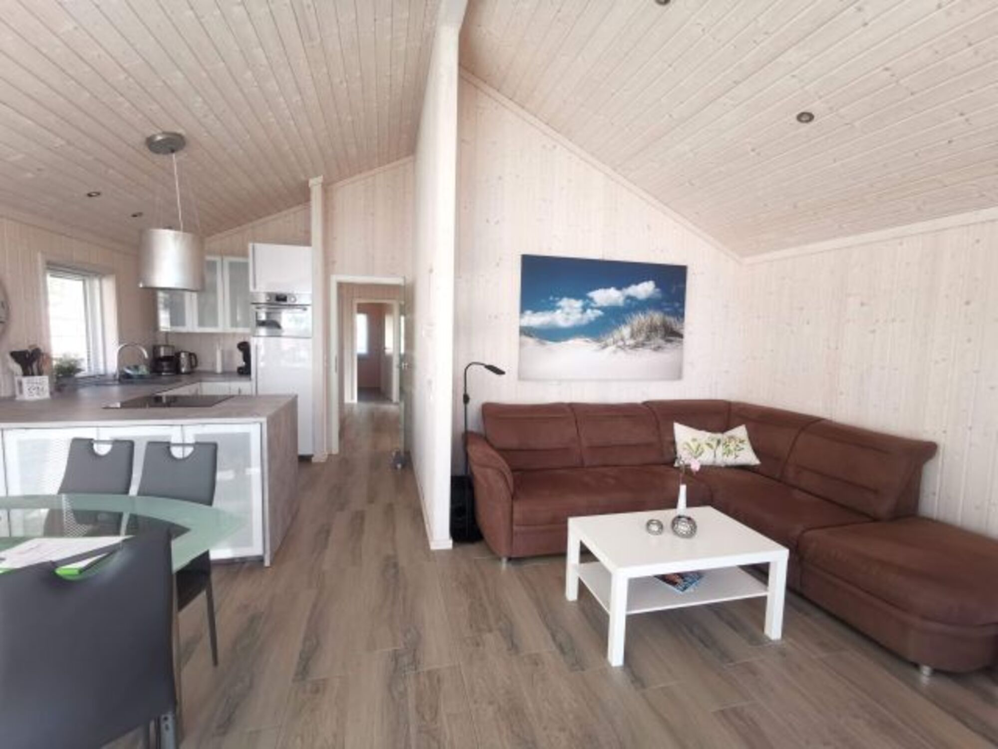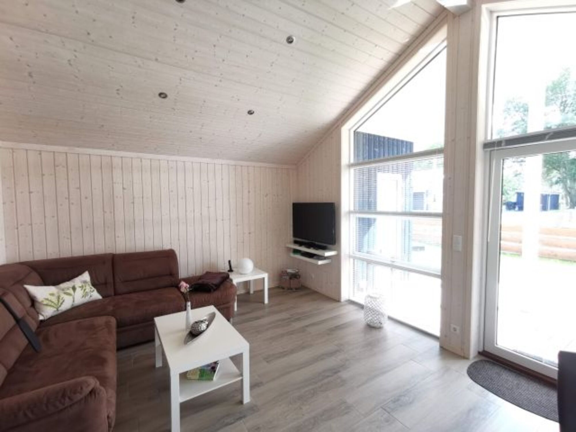 Das Wohnzimmer ist direkt nach Süden ausgerichtet und durch die vollverglaste Giebelfront hat man einen tollen Blick auf den nur ca.50 m entfernten großen Plöner See.