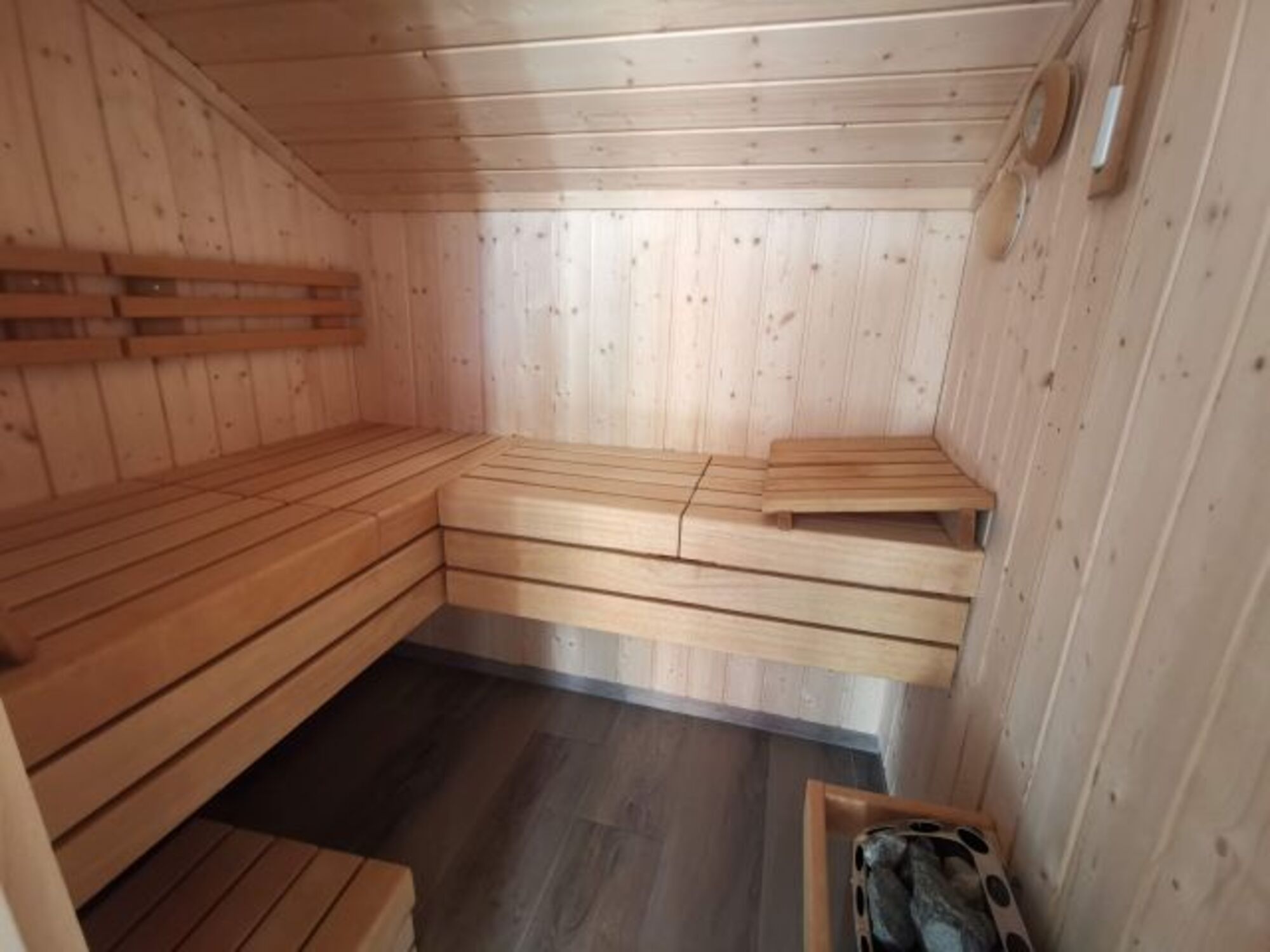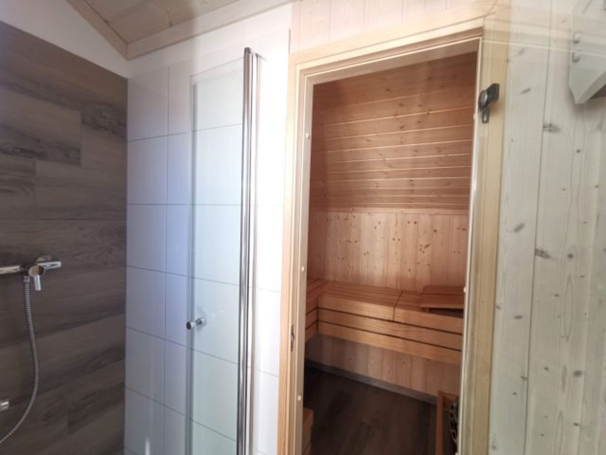Die Sauna mit extra Dusche ist vorn von der Terrasse aus zugänglich. Dann kann man nach dem Saunagang sofort in die Ruhephase auf einer der Gartenliegen auf der Holzterrasse starten.